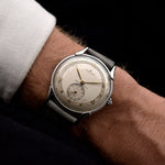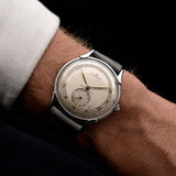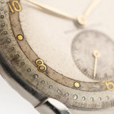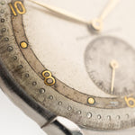 銀色雙色副秒針表盤搭配裝飾藝術風格的數字、金色葉形指針、銀色點狀分針軌道,這款美麗的腕錶在生產 80 年後依然引人注目。蘑菇狀錶冠和弧形錶耳更是錦上添花。