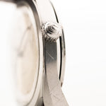 您在此看到的版本是不銹鋼無日期保險桿版本,配備令人驚艷的銀色/奶油色交叉髮絲錶盤和鏡面不銹鋼章環,在光線下發揮驚人的效果。
