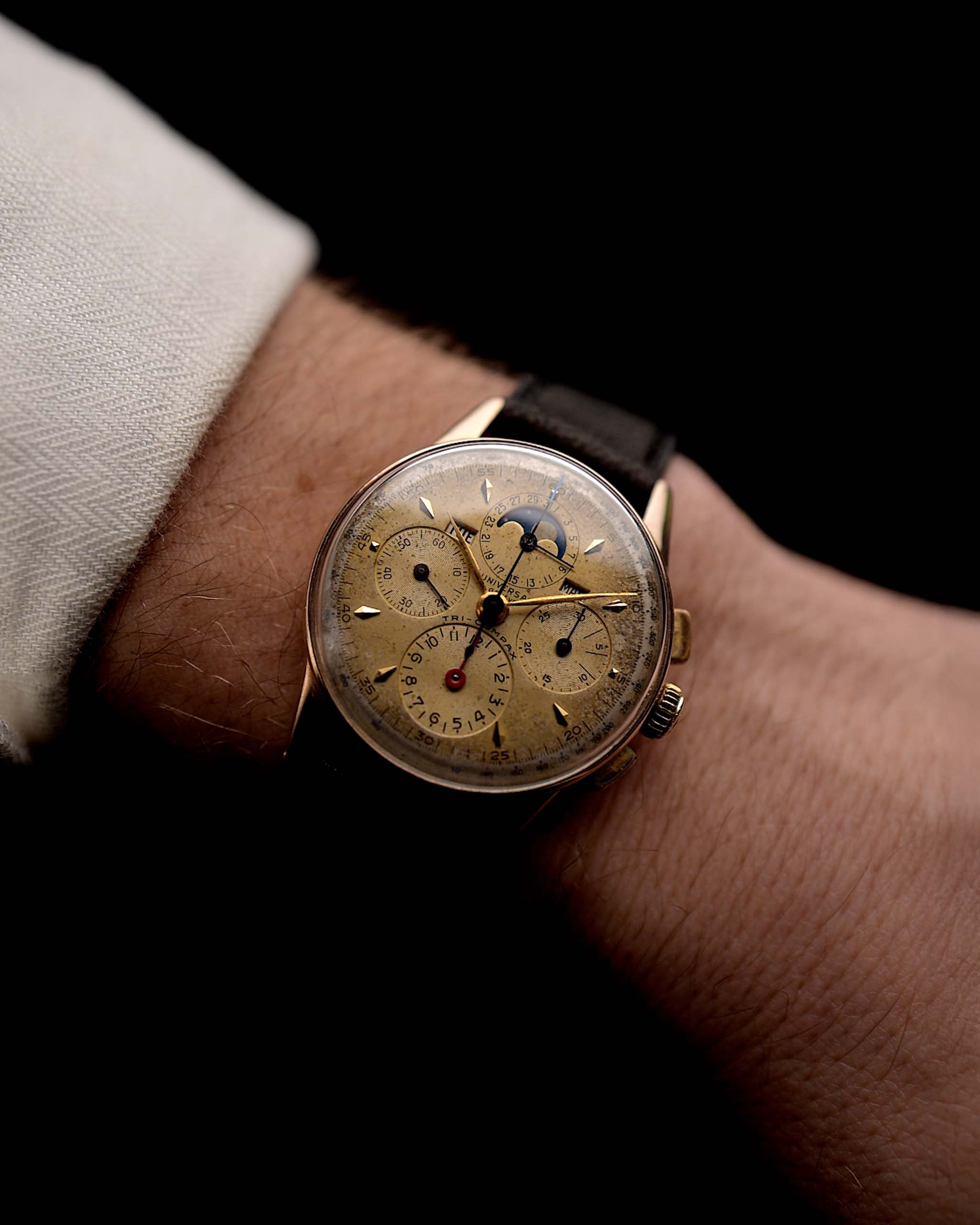 我們這款來自 1940 年代的 22258 不僅是這款腕錶的典範,也是 Tri Compax 如此受追捧的最佳證明。它擁有美麗的 18K 玫瑰金錶殼與斜角錶耳,錶盤佈局令人愛不釋手。