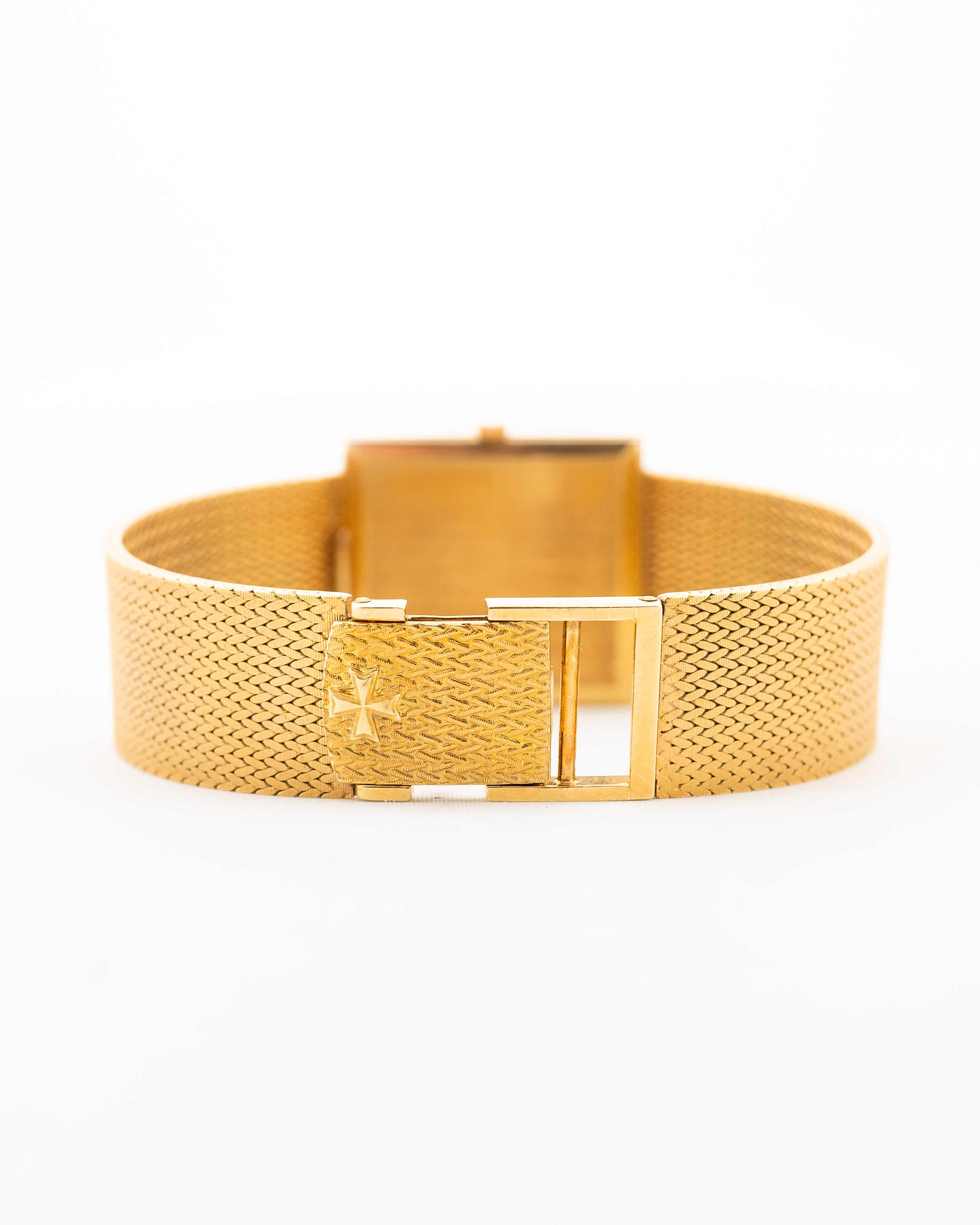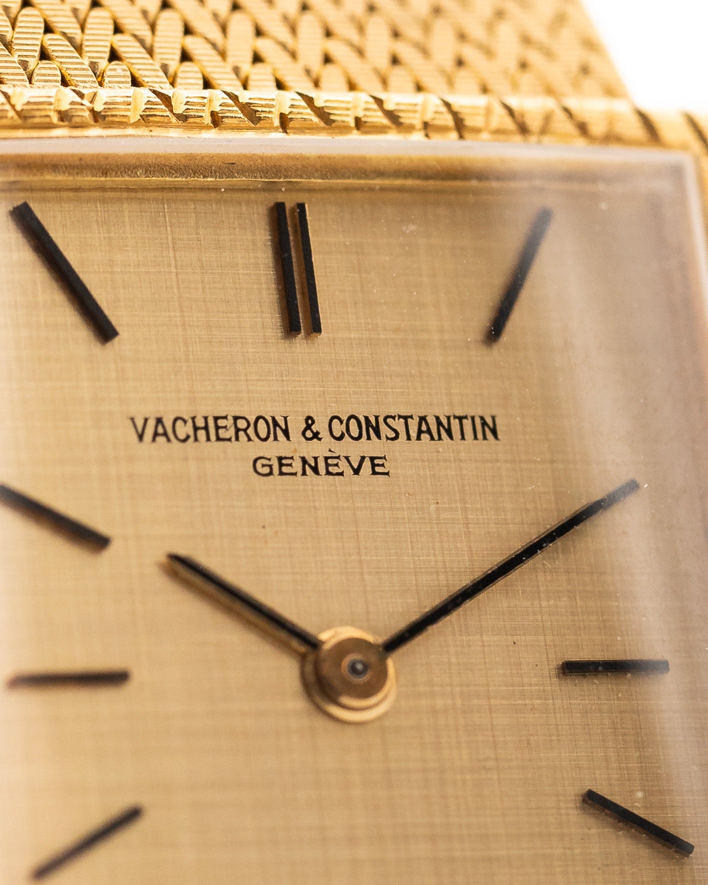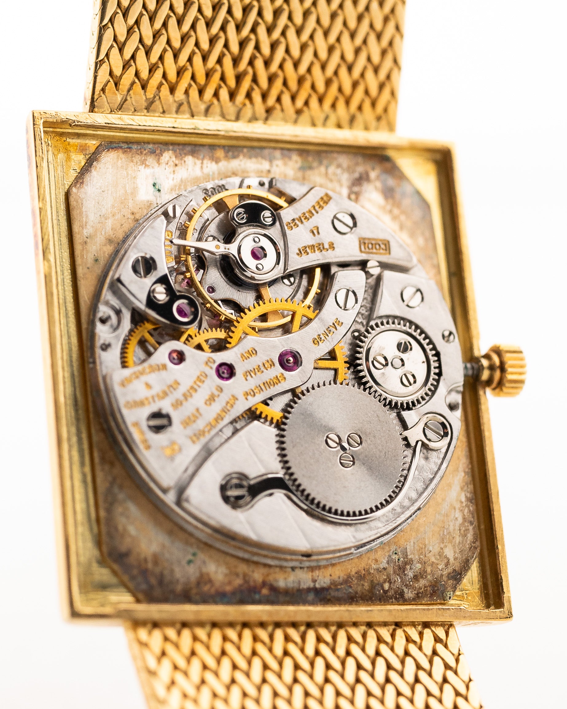 這是一款精美的 18K 黃金江詩丹頓 Tank 正裝腕錶,來自 1970 年代,搭配令人驚艷的 18K 實心黃金編織錶帶。