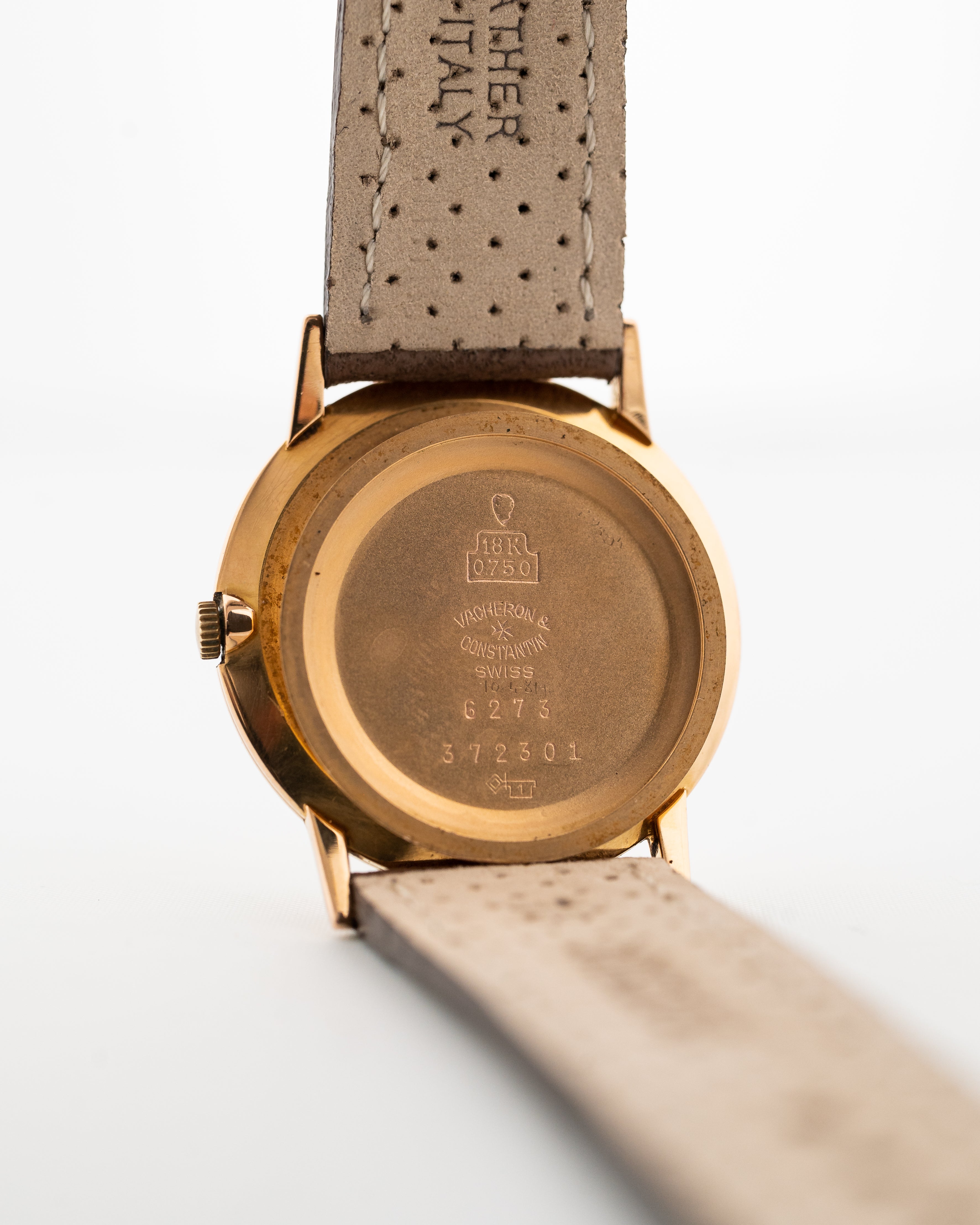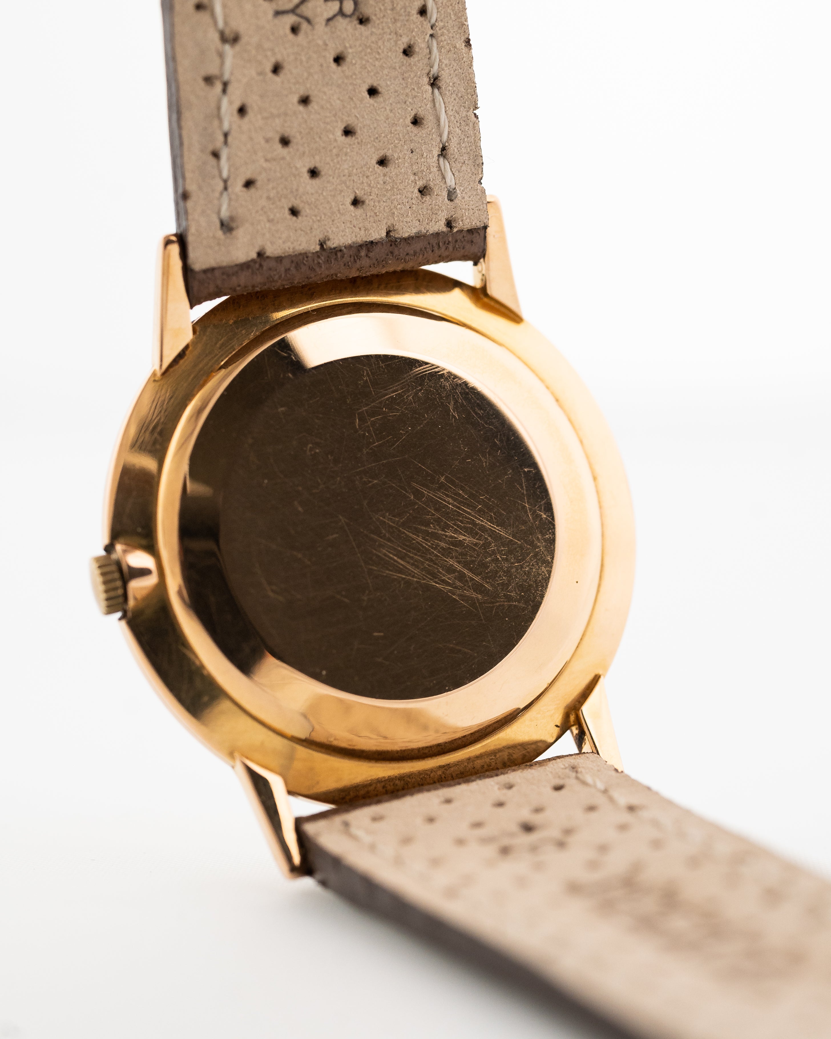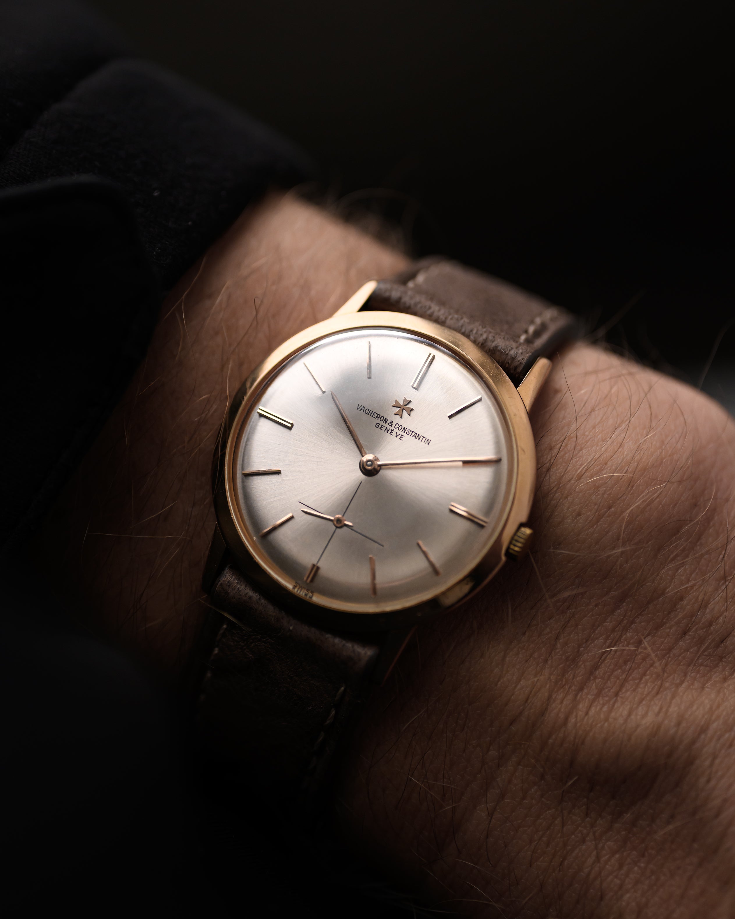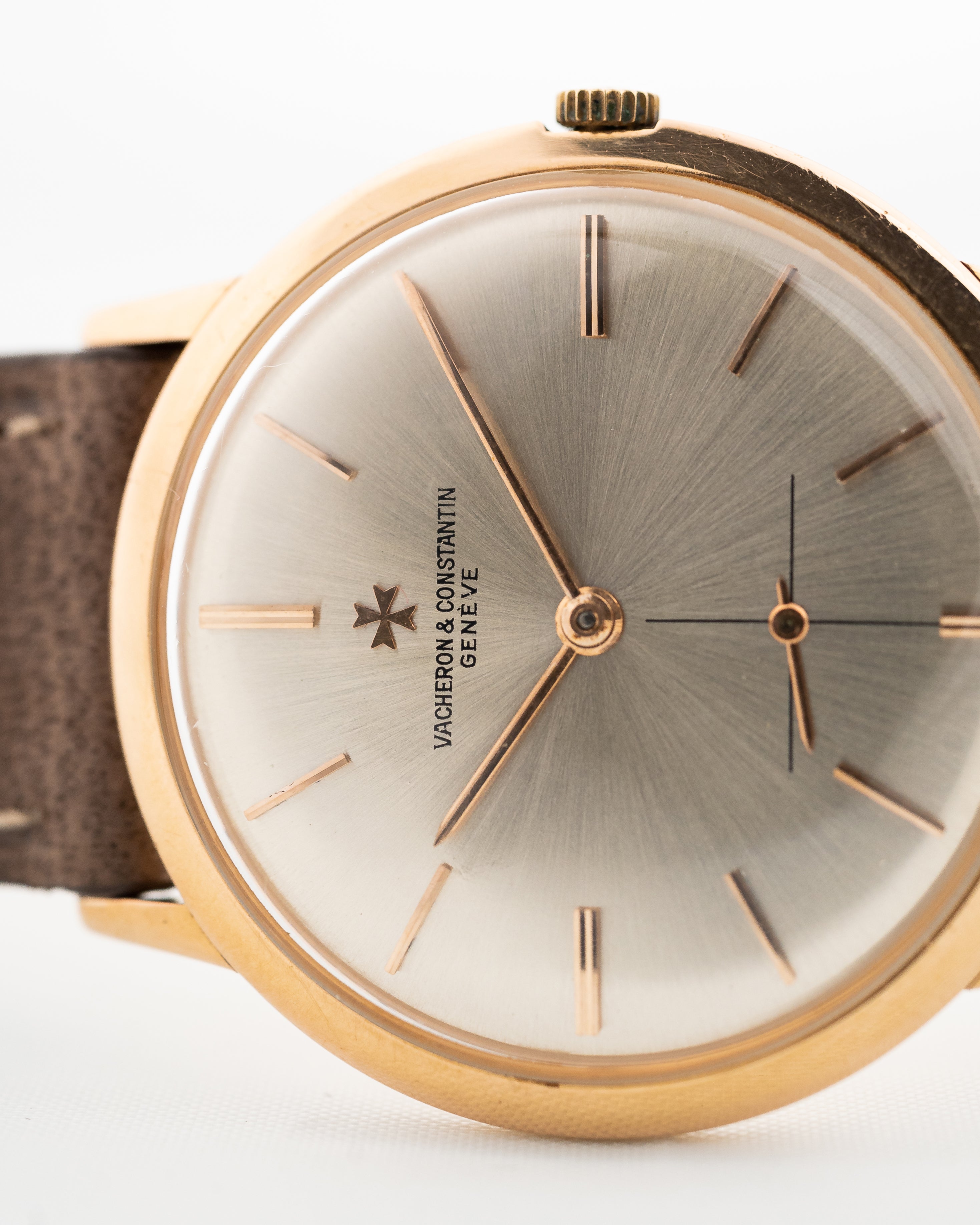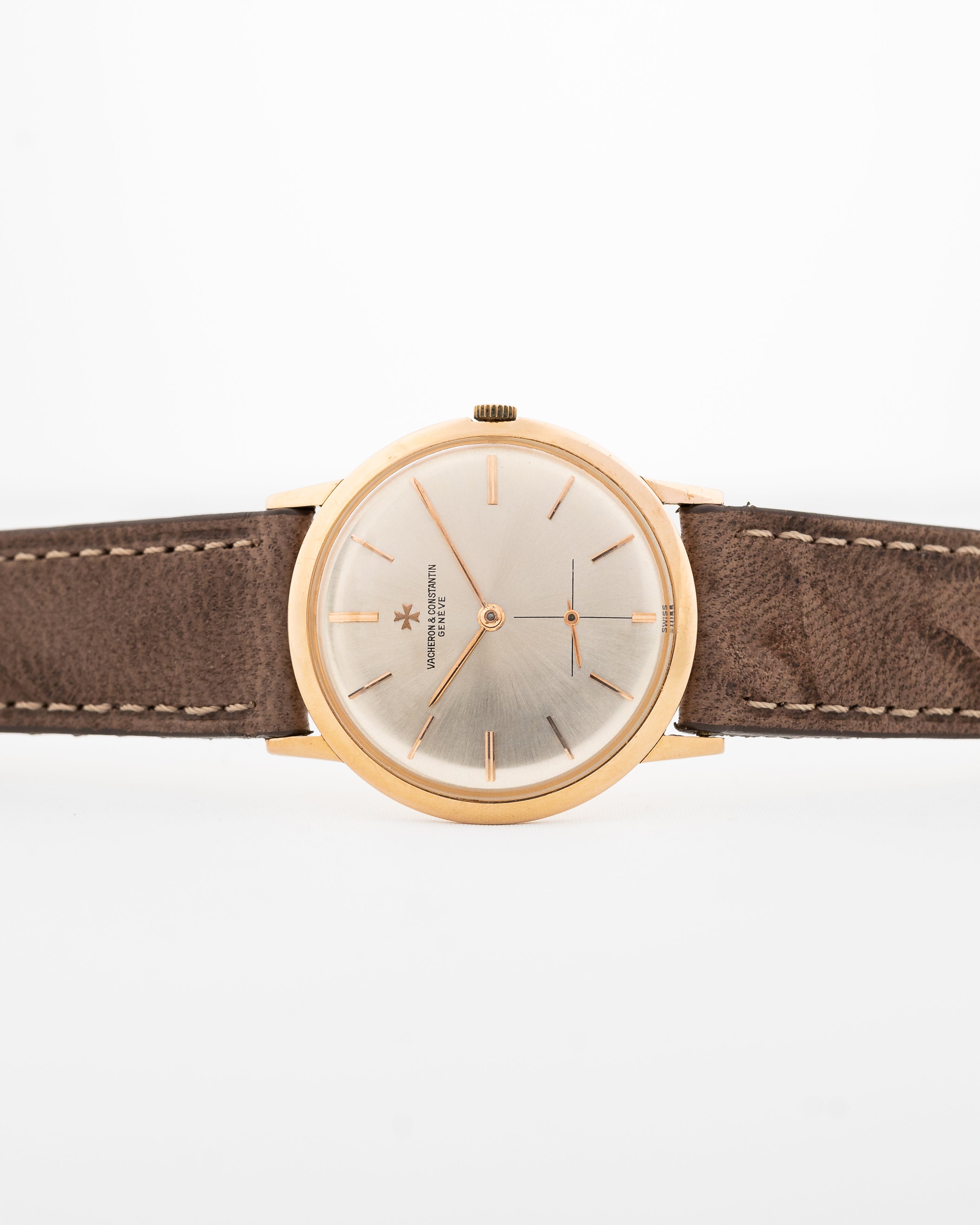 這款 18K 黃金江詩丹頓正裝腕錶來自 1960 年代,做工精美。這款特別的腕錶以其美麗的銀色太陽紋錶盤、鑲貼的江詩丹頓標誌、簡潔的副秒針以及堅固的未拋光 18K 玫瑰金錶殼而著稱。