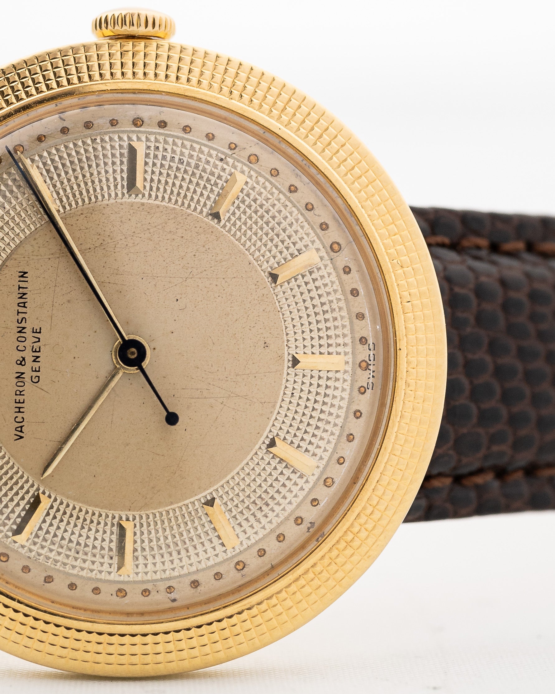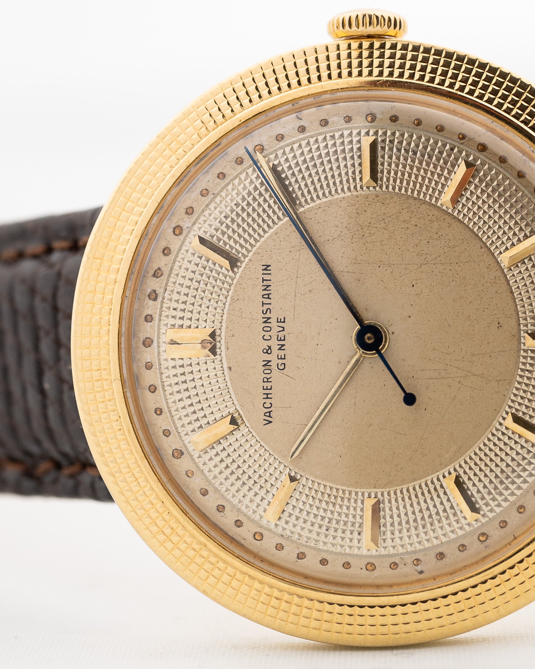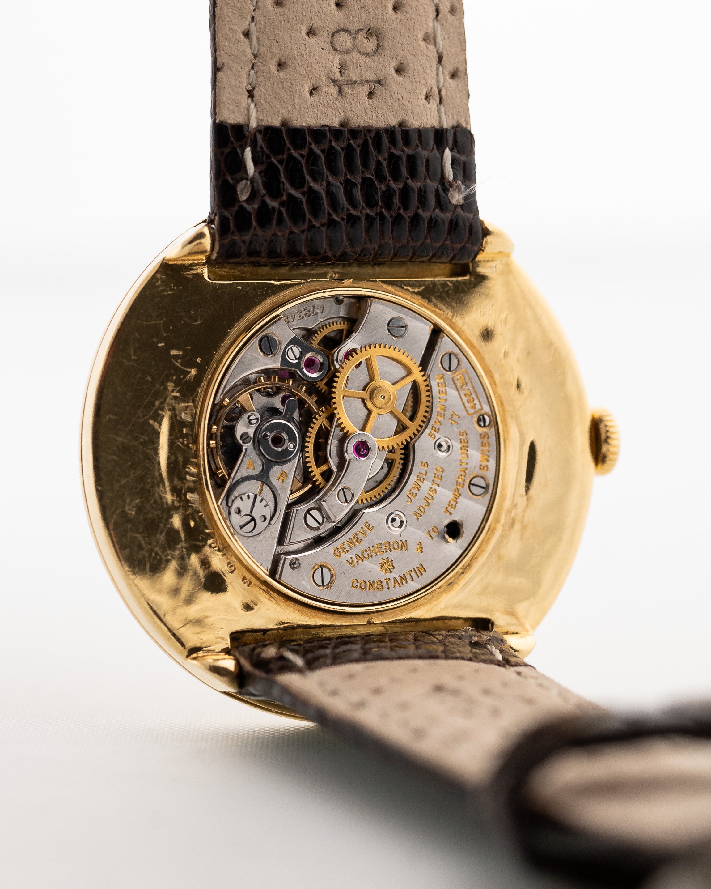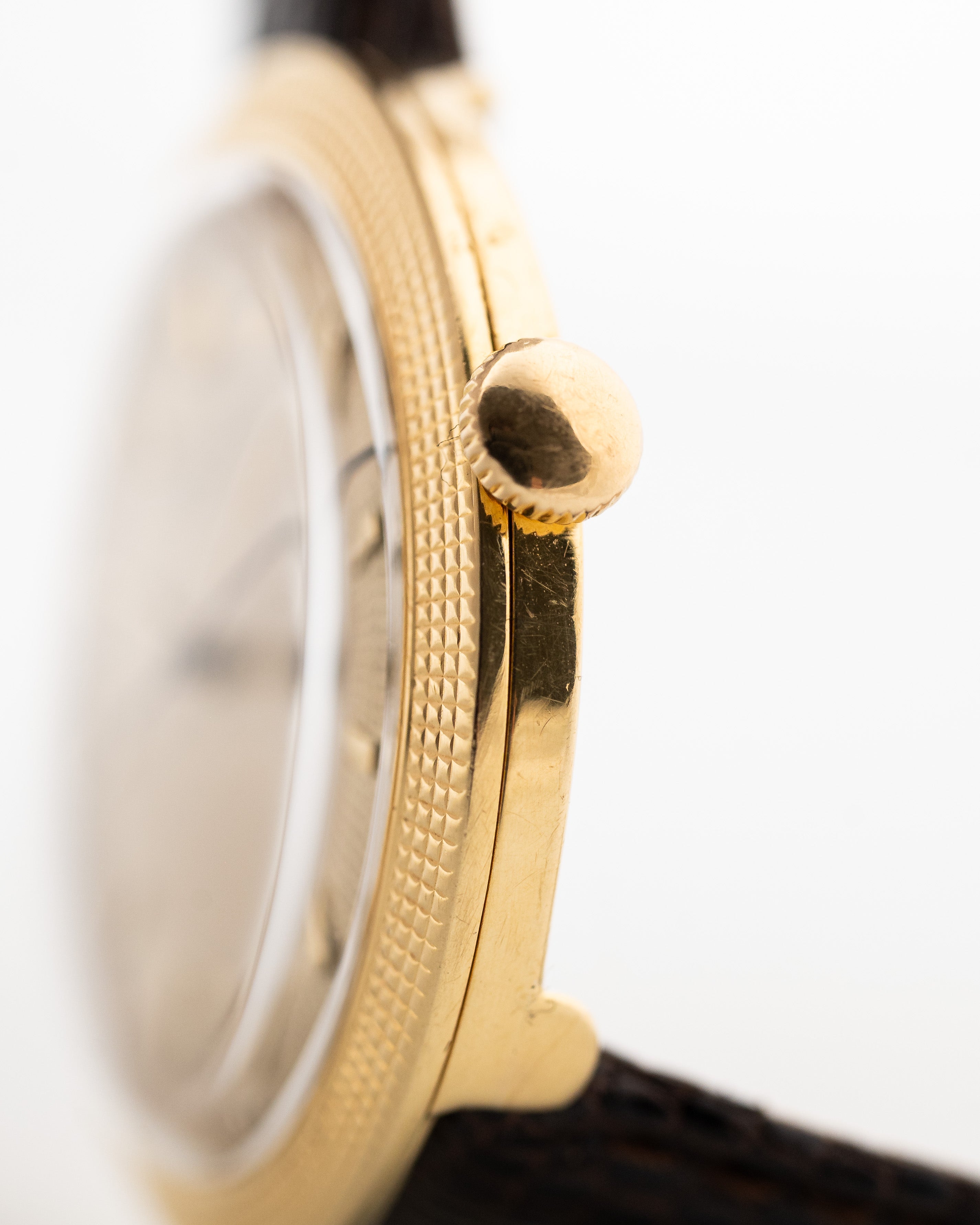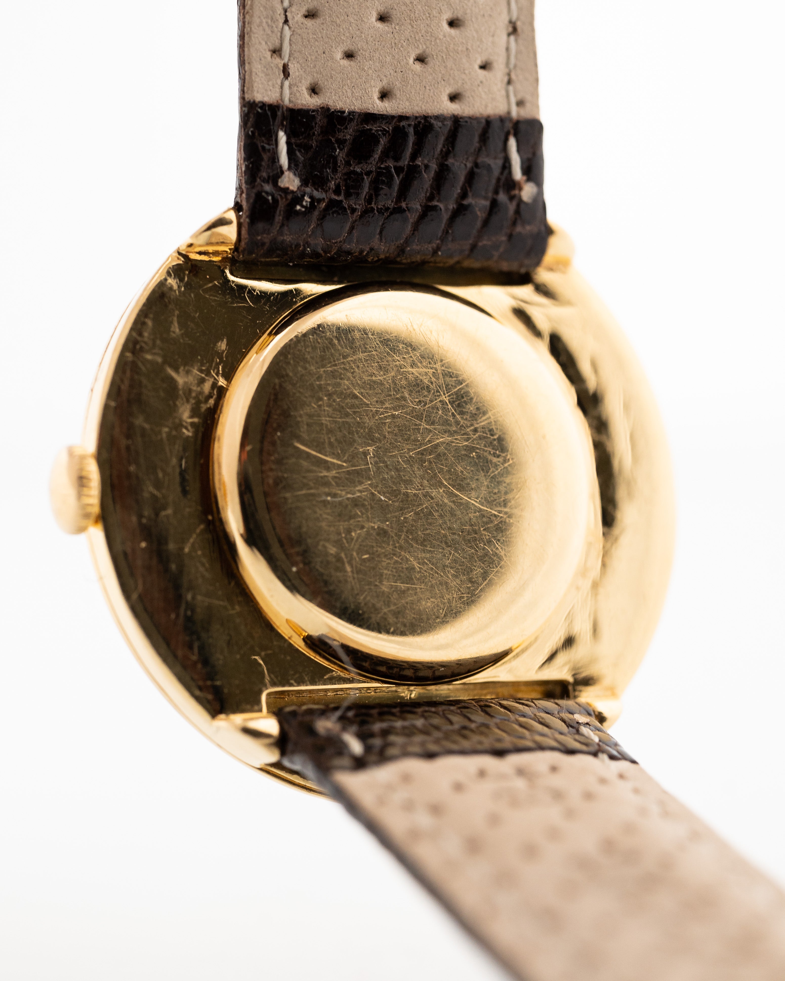 在錶背內側,我們還發現了帶有數字 5 的 「日內瓦鑰匙 」印記,它告訴我們錶殼是由 "Croisier, Georges "在日內瓦製造的,該公司自 1934 年至 1991 年一直生產華沙錶殼。