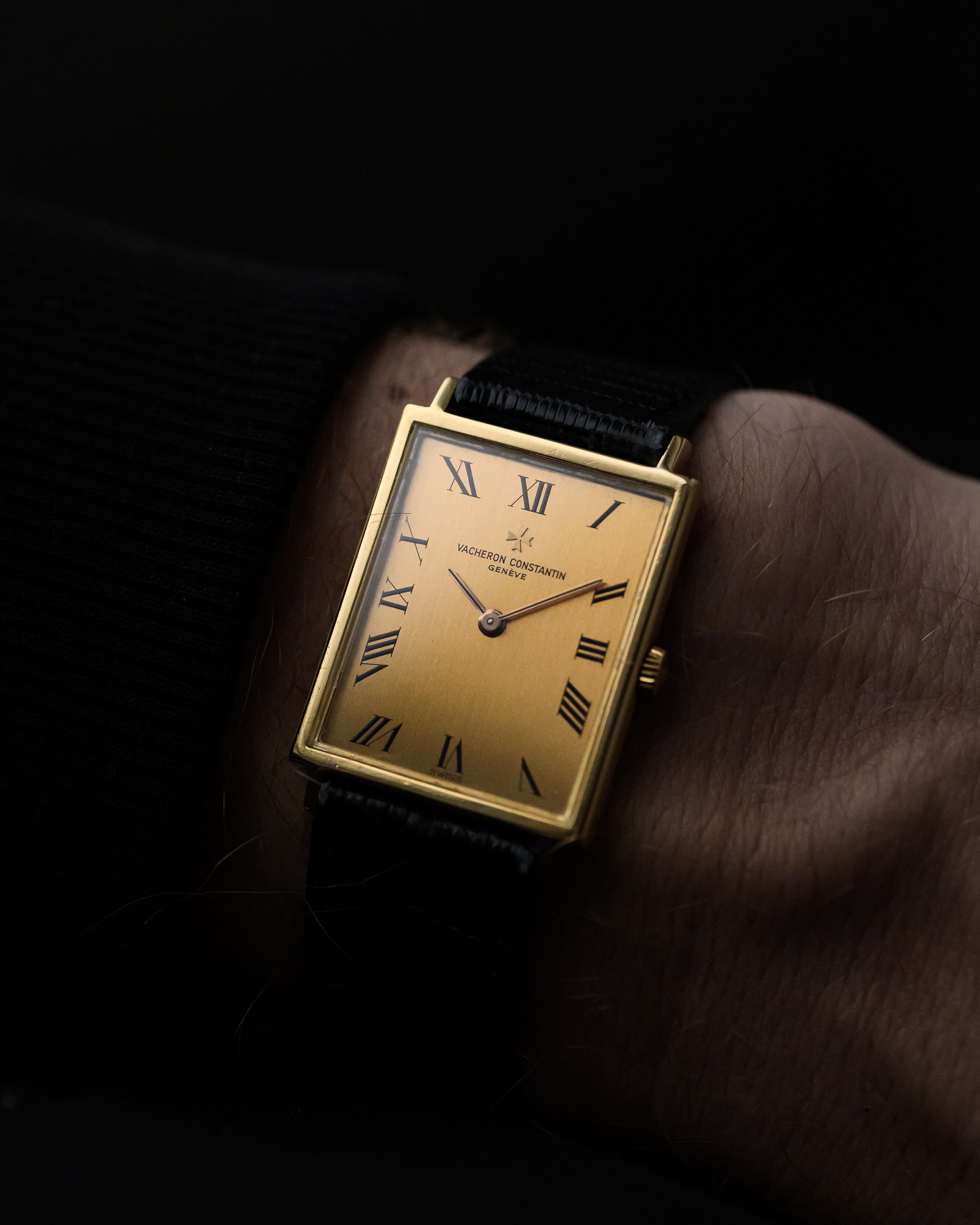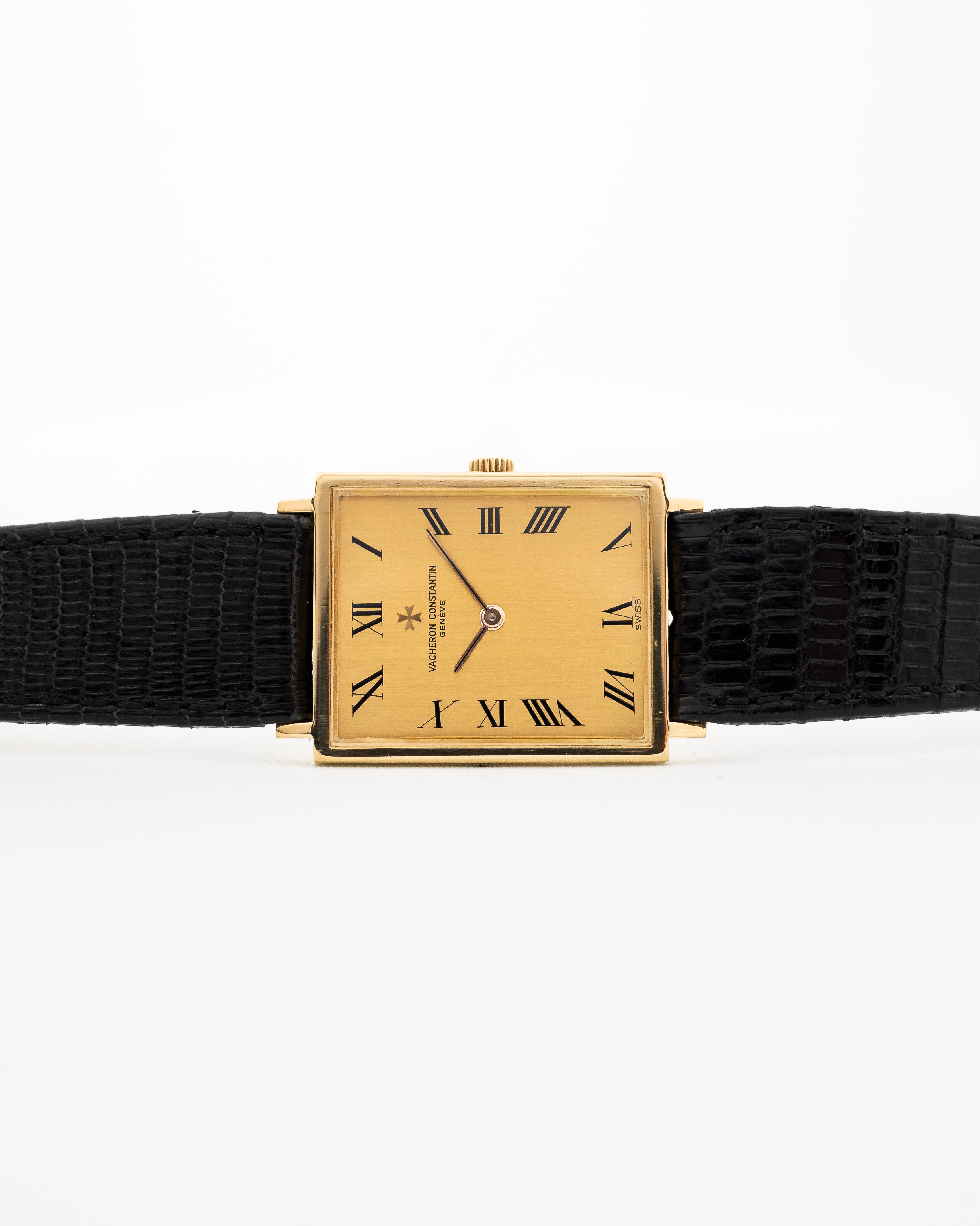 這款江詩丹頓 Ref.39011正裝腕錶。這款特別的腕錶以其美麗的黃金錶盤搭配羅馬數字和堅固的未拋光 18K 黃金長方形錶殼而著稱。