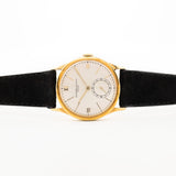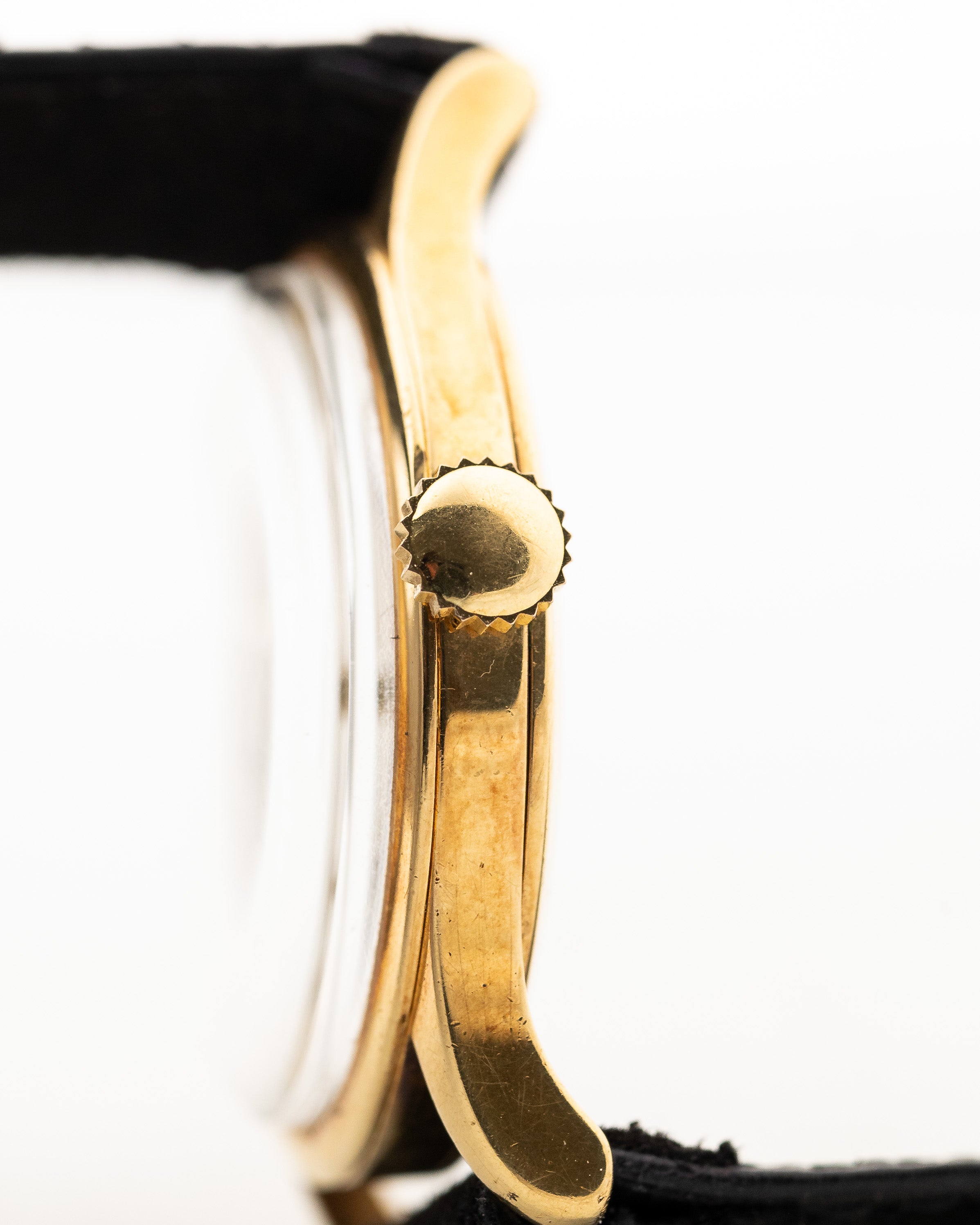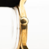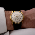 這件特別的作品以其極佳的狀態、堅固的 18K 黃金錶殼以及排列美觀的 3、9 和 12 點鐘位置的金色羅馬數字而著稱。