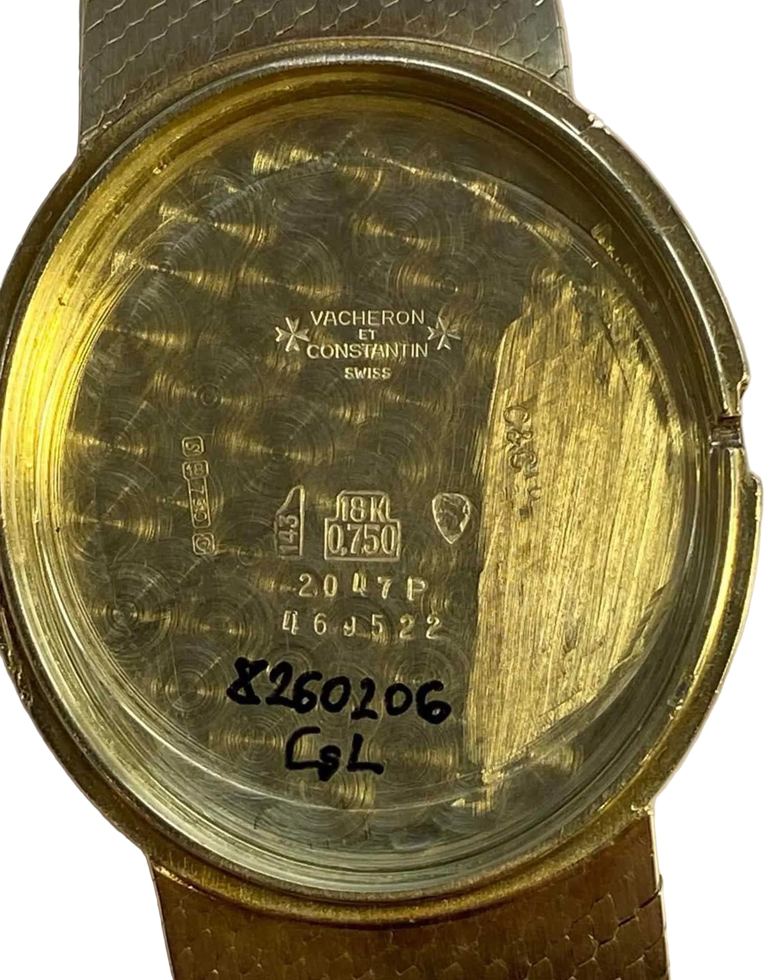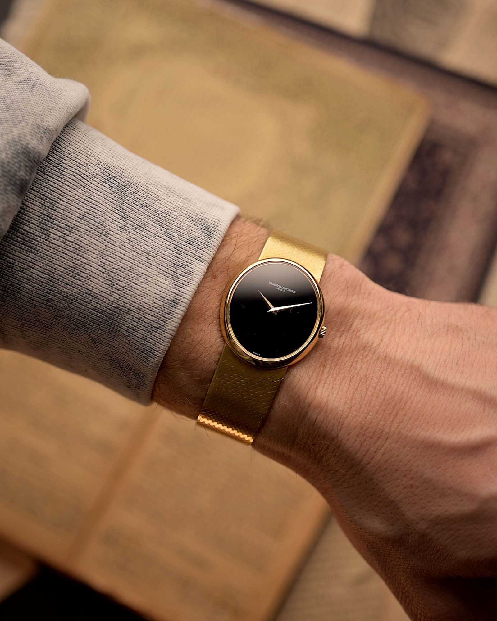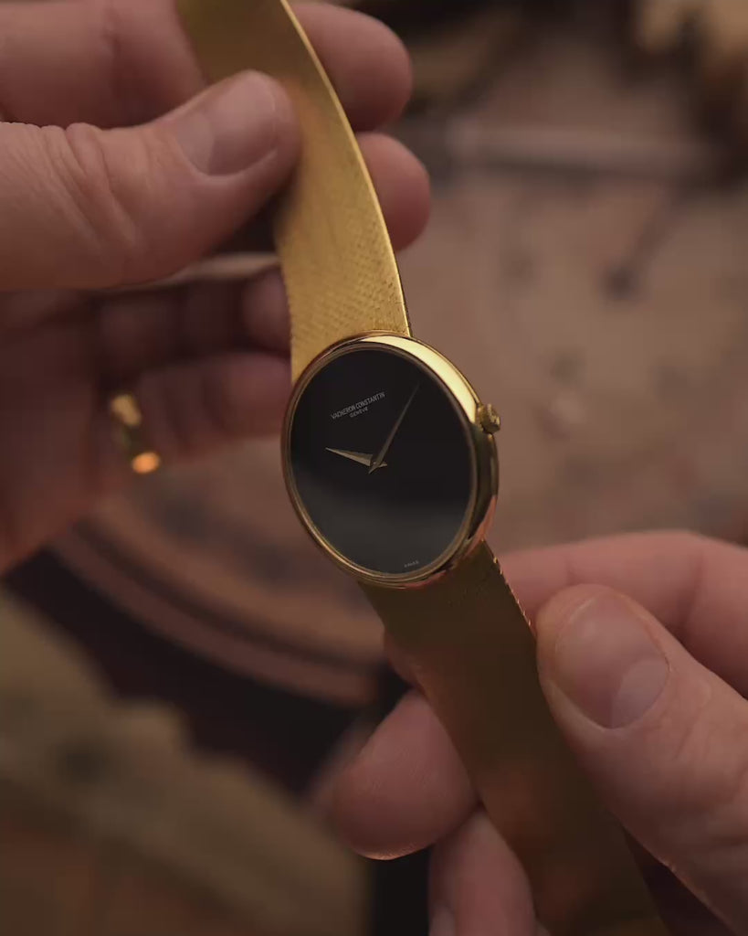 這款1970年代江詩丹頓2047P型號腕錶,堪稱極簡奢華的典範之作。橢圓形18K黃金錶殼內,縷黑瑪瑙錶盤散發著靜謐的優雅氣息。錶盤上印製的江詩丹頓標誌與金色字母指針,以品牌標誌性的精緻工藝,為簡約設計增添非凡韻味。
