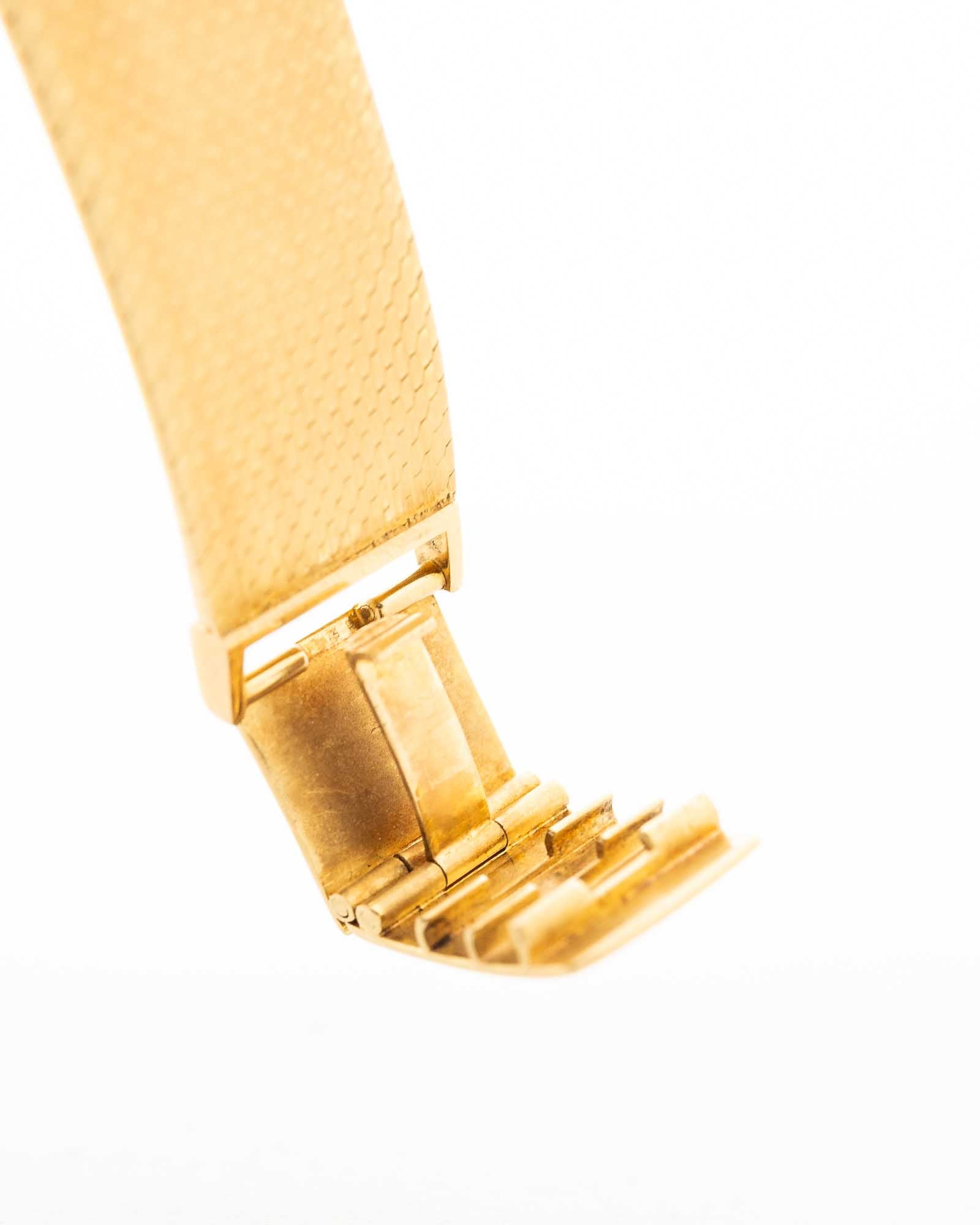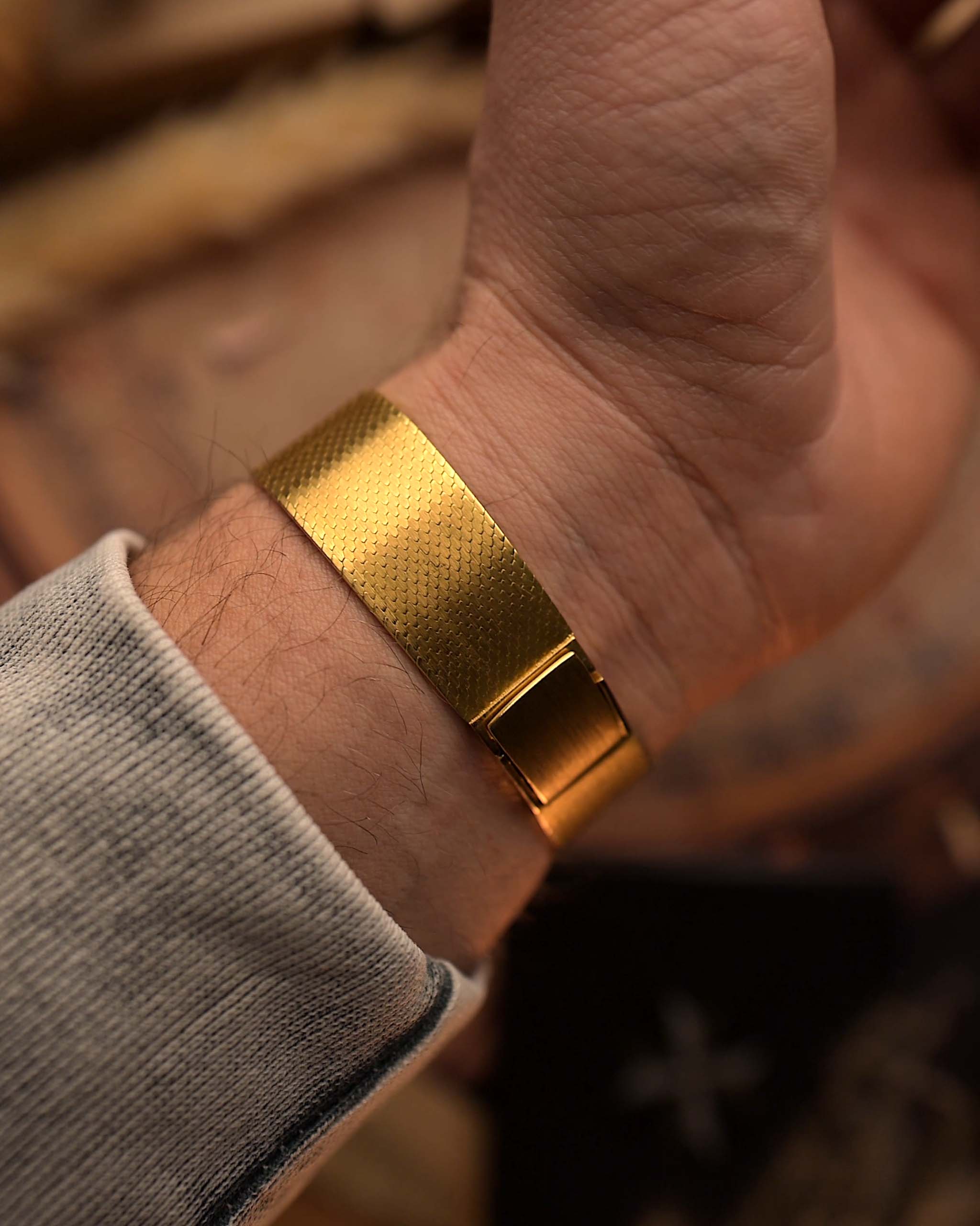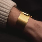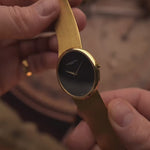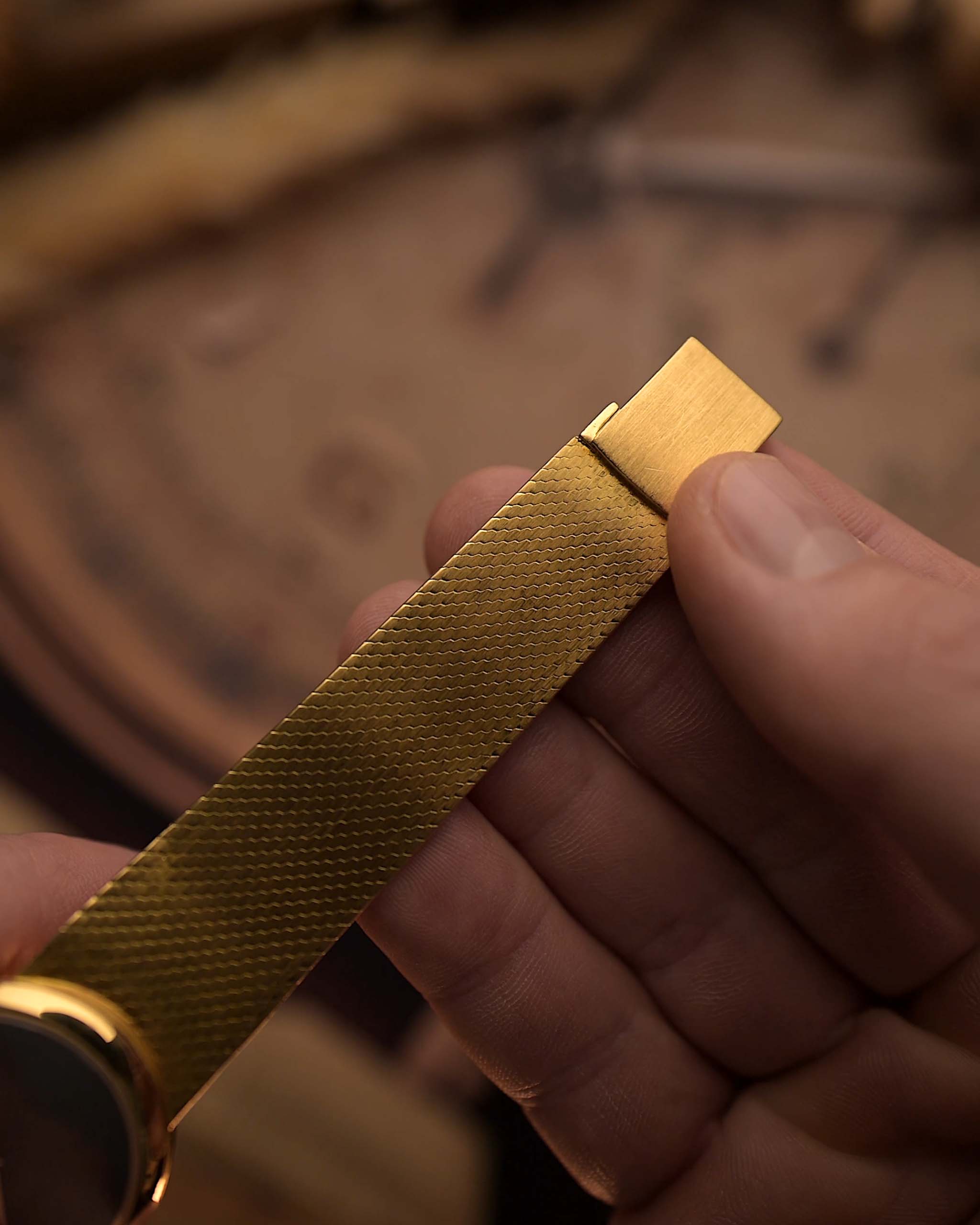 此款腕錶的優雅之處,在於原創的18K實心黃金錶帶 與錶殼無縫銜接, 成就真正一體成型的復古風貌。內部搭載手動上鍊的1003機芯,以纖薄、精準與可靠著稱。