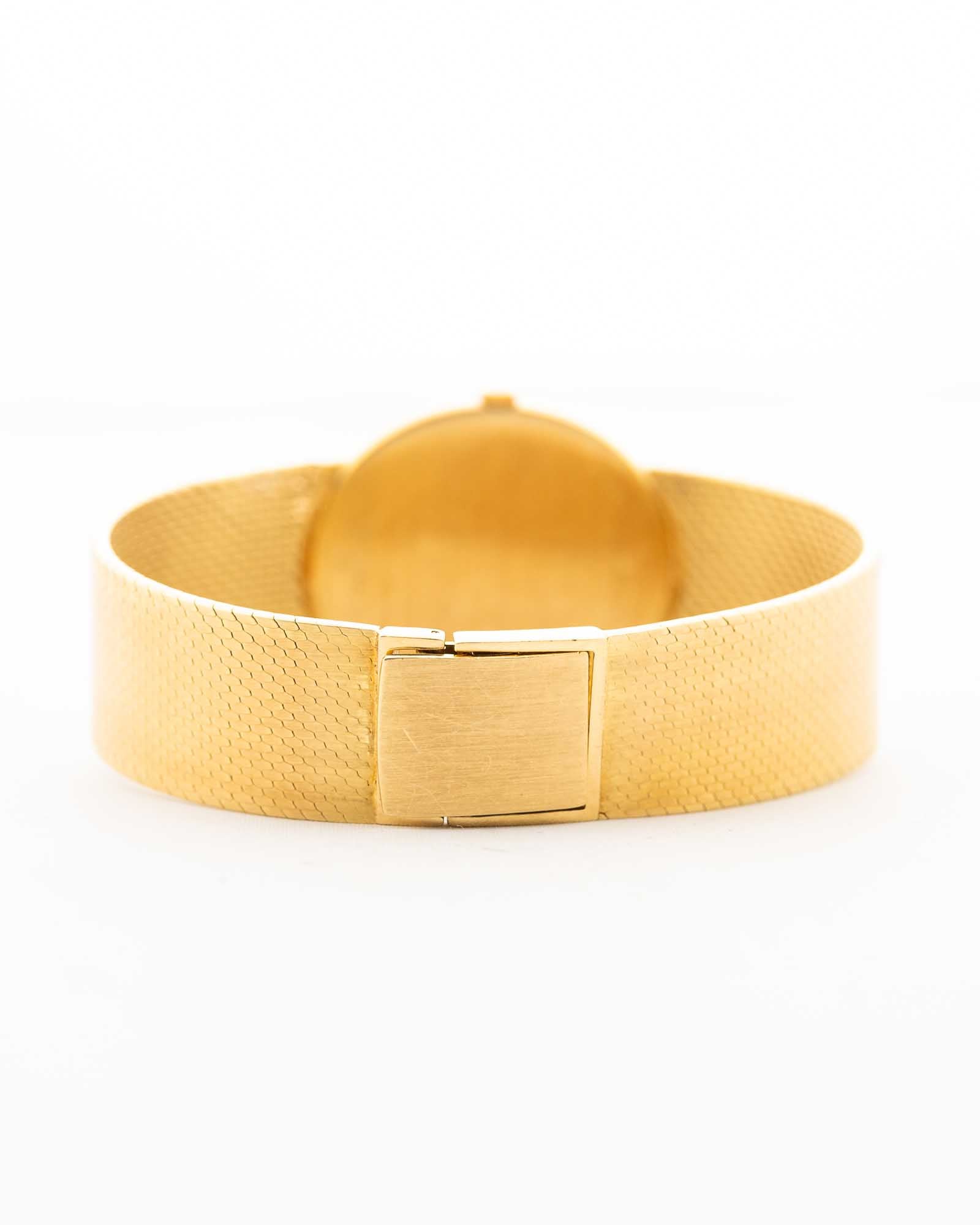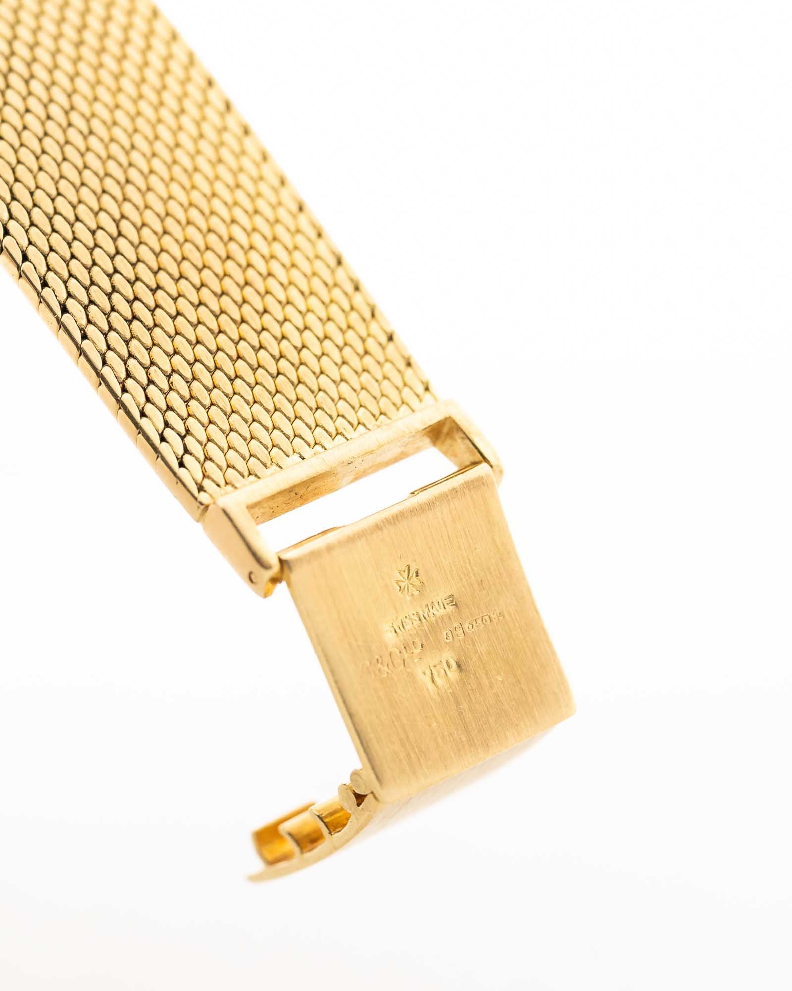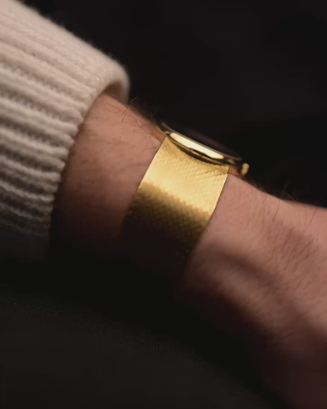 此款腕錶的優雅之處,在於原創的18K實心黃金錶帶 與錶殼無縫銜接, 成就真正一體成型的復古風貌。內部搭載手動上鍊的1003機芯,以纖薄、精準與可靠著稱。