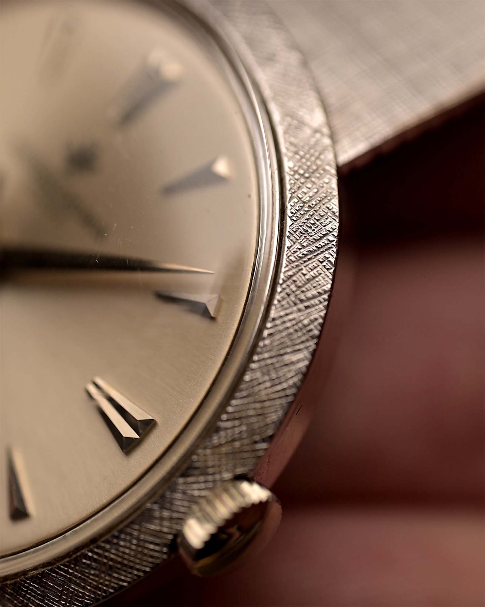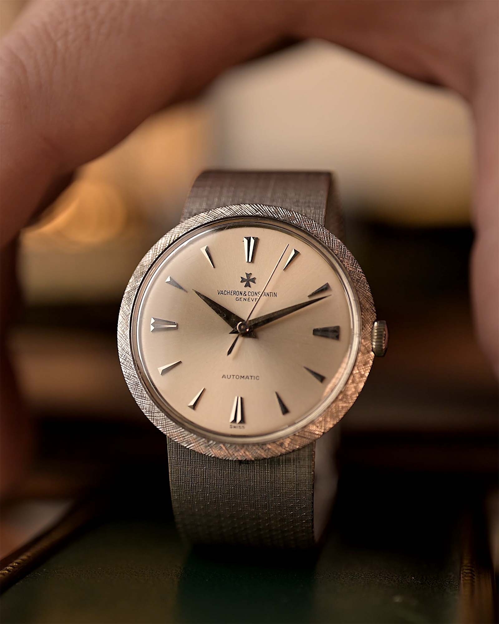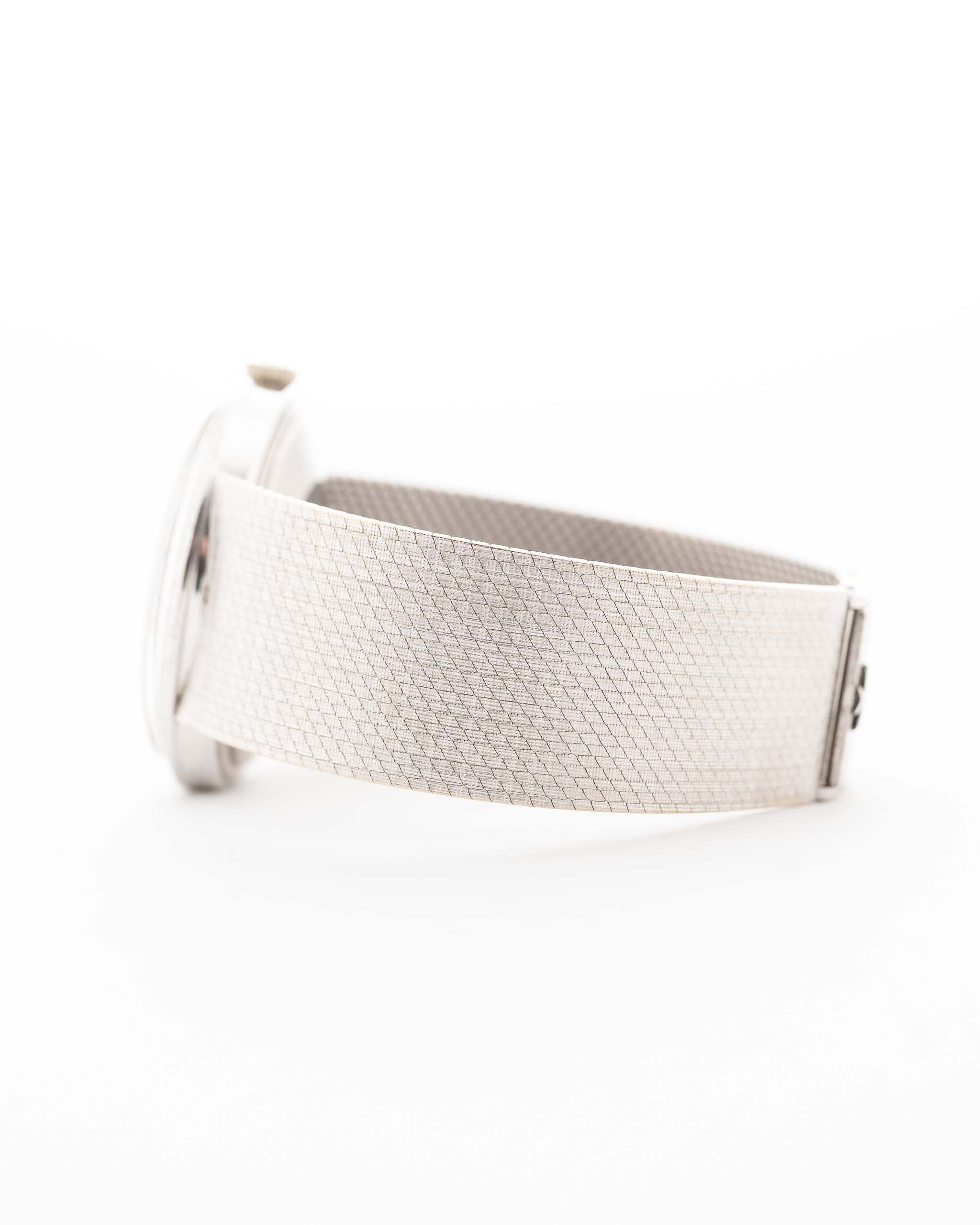 The original silver dial is untouched and flawlessly preserved, while the finely textured 18k white gold bracelet offers a uniquely tactile experience — complete with the Maltese cross clasp.