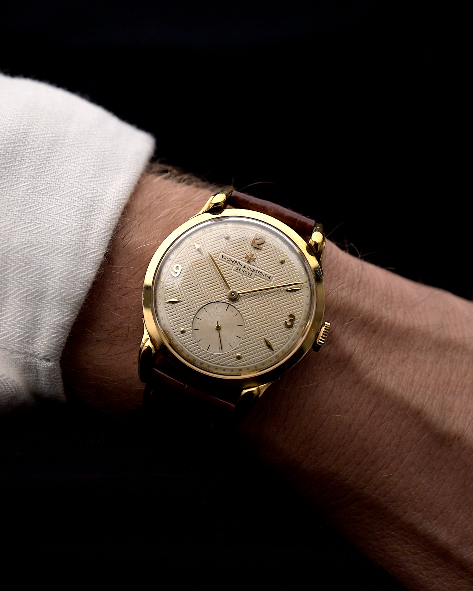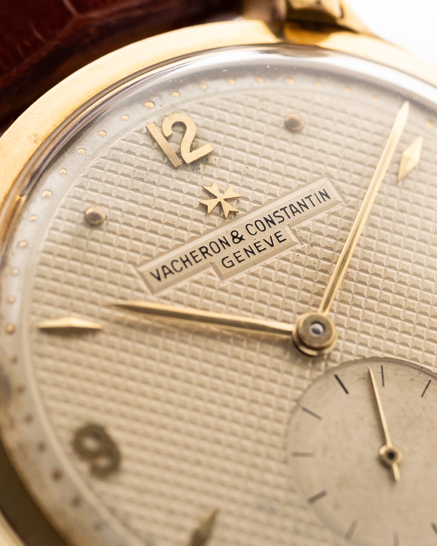 這件作品擁有非常獨特的奶油色蜂巢狀錶盤,搭配鑲貼的 18K 時標、阿拉伯數字和乾淨的指針,以及美麗的分鐘刻度。
