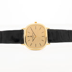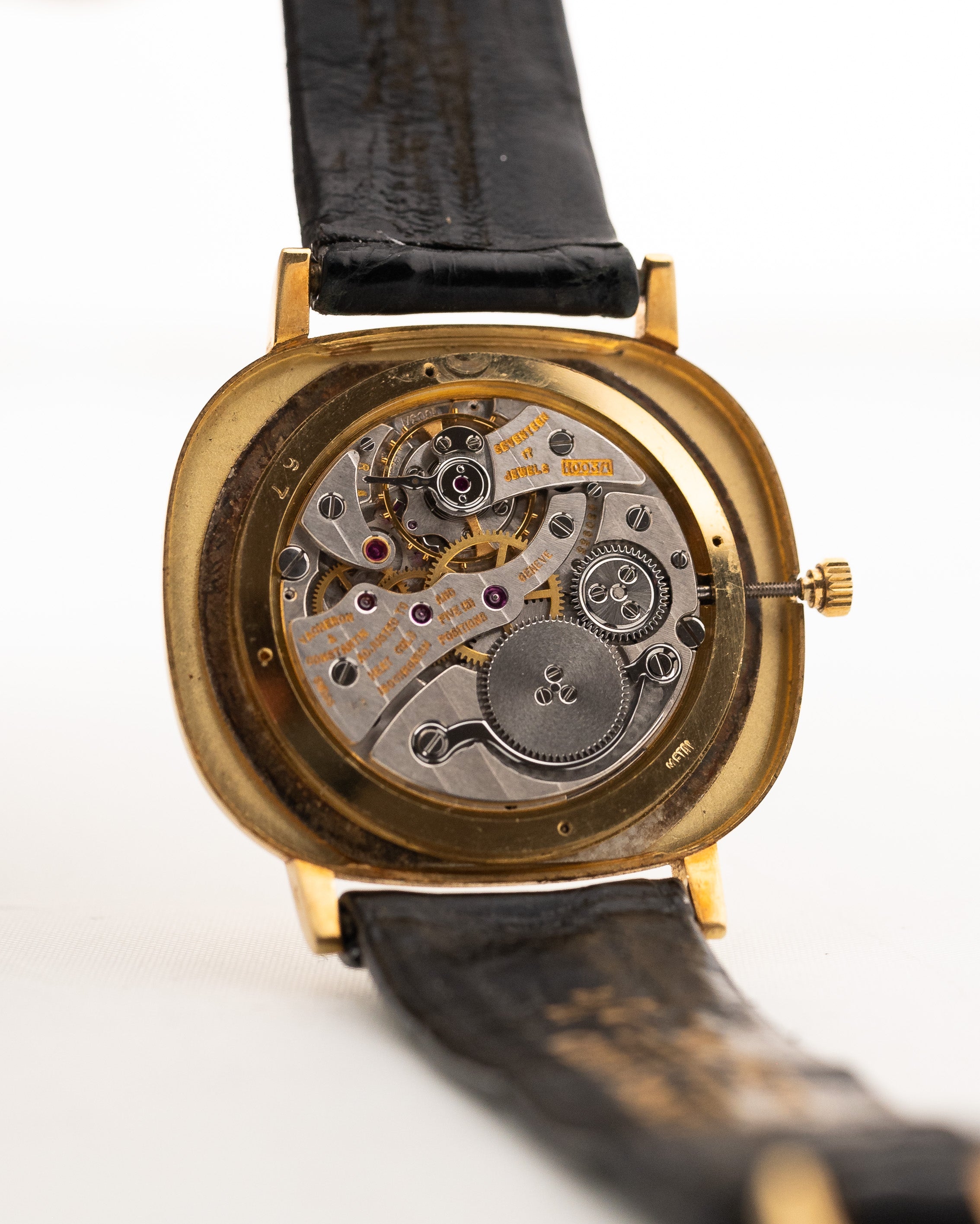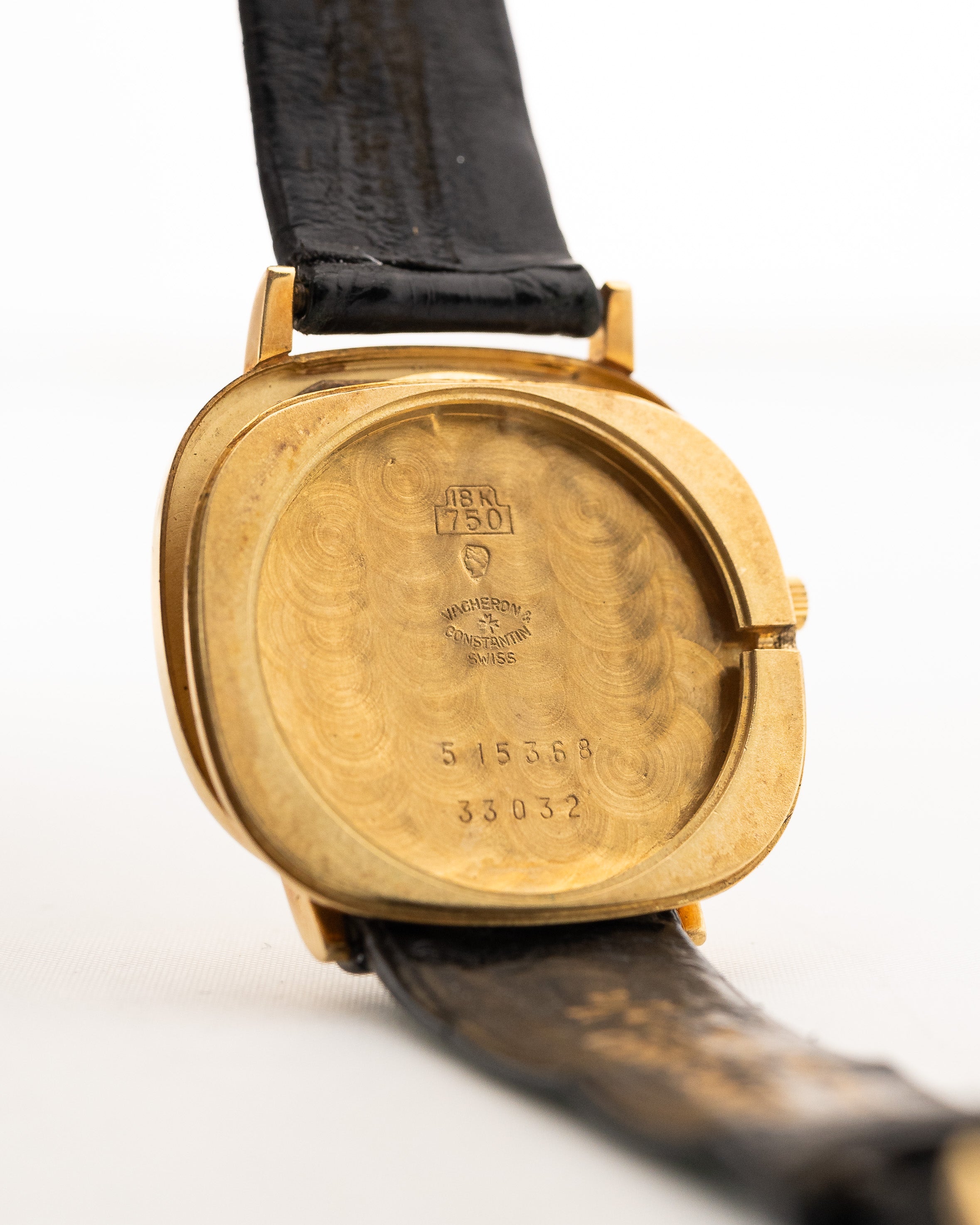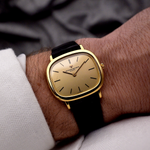 這款 18K 黃金江詩丹頓正裝腕錶採用 1970 年代的坦克式設計,做工精美。這款腕錶的特色在於其精美的 18K sigma 表盤、鑲貼的江詩丹頓標誌、堅固的 18K 黃金錶殼以及縞瑪瑙分層指針和時標。腕錶搭配江詩丹頓原廠真皮錶帶和 18K 黃金 VC 錶扣。