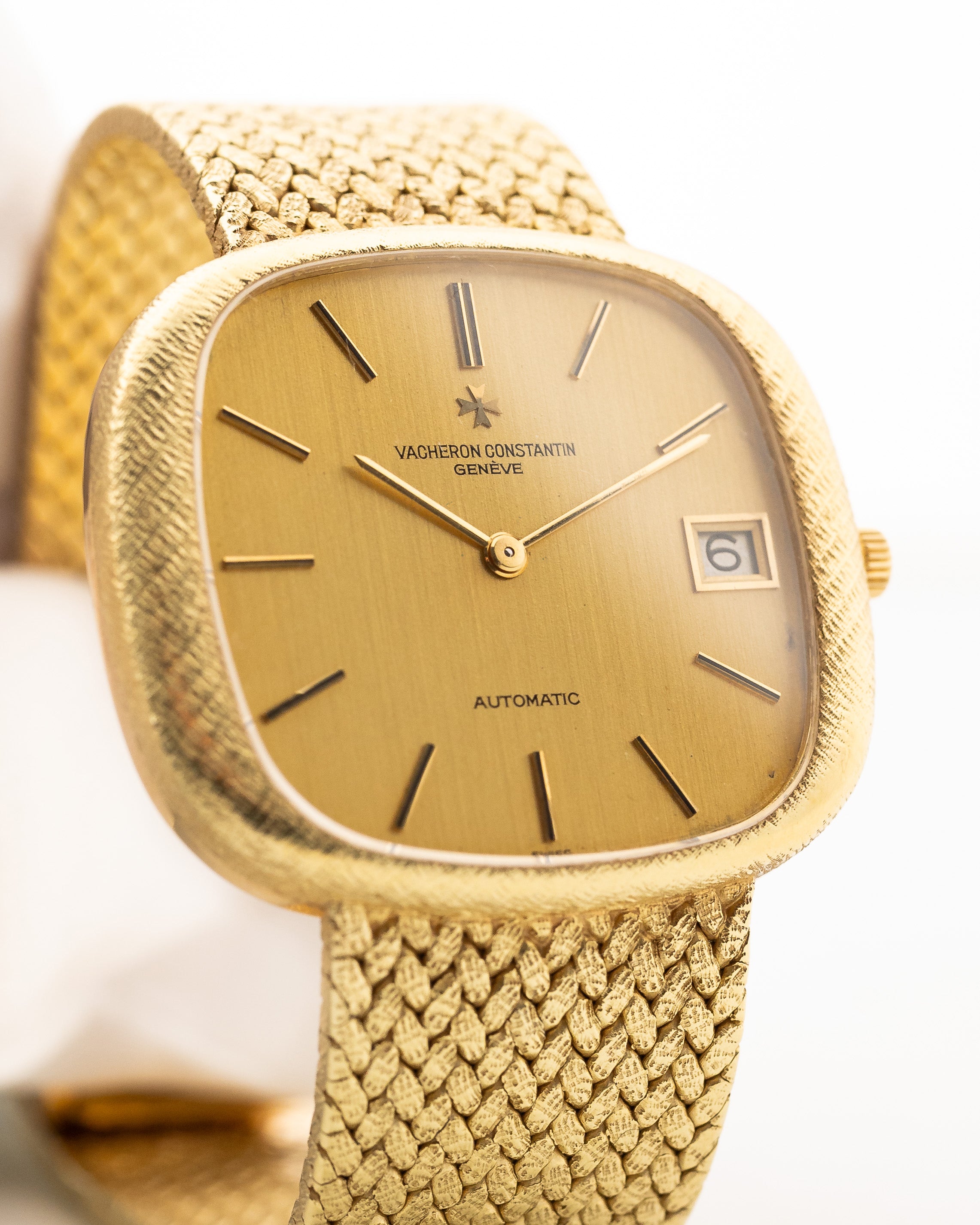 這是一款精美的 18K 黃金鍛造江詩丹頓 1970 年代正裝腕錶,搭配令人驚艷的 18K 實心黃金編織錶帶。